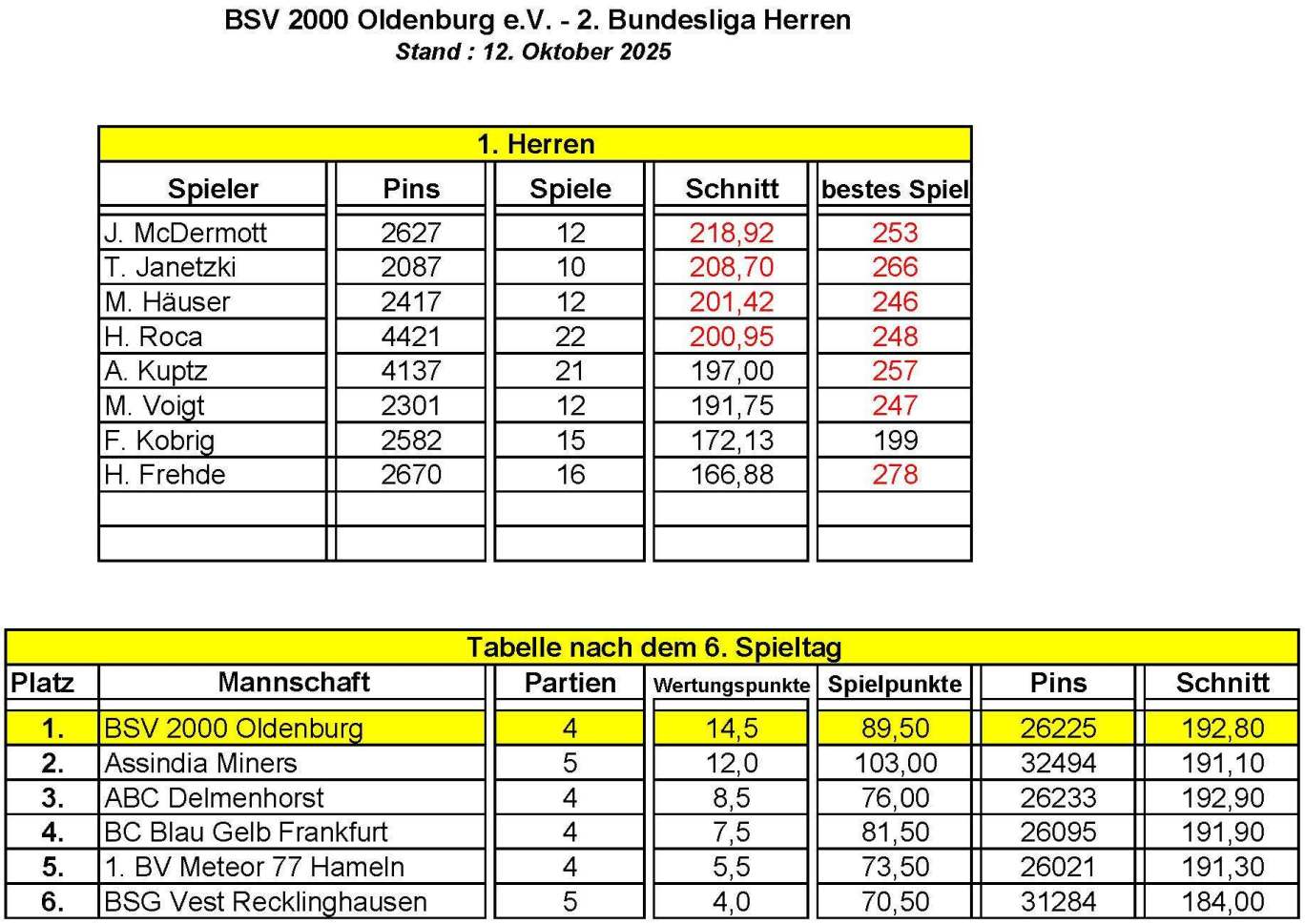 Am Samstag gegen spielten Hector Roca (965 / 241,25), Henning Frehde (456 / 228,0), Anton Kuptz (1264 / 210,67), Markus Häuser (1171 / 195,17), Tom Janetzki (769 / 192,25), Marvin Voigt (1138 / 189,67) und Fabian Kobrig (346 / 173,00).