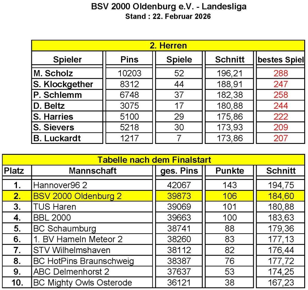 Gespielt haben Stefan Klockgether (1846 / 205,1); Marc Scholz (1714 / 190,4); Daniel Beltz (1707 / 189,7); Sven Harries (1517 / 189,6) und Patrick Schlemm (139 / 139,0).