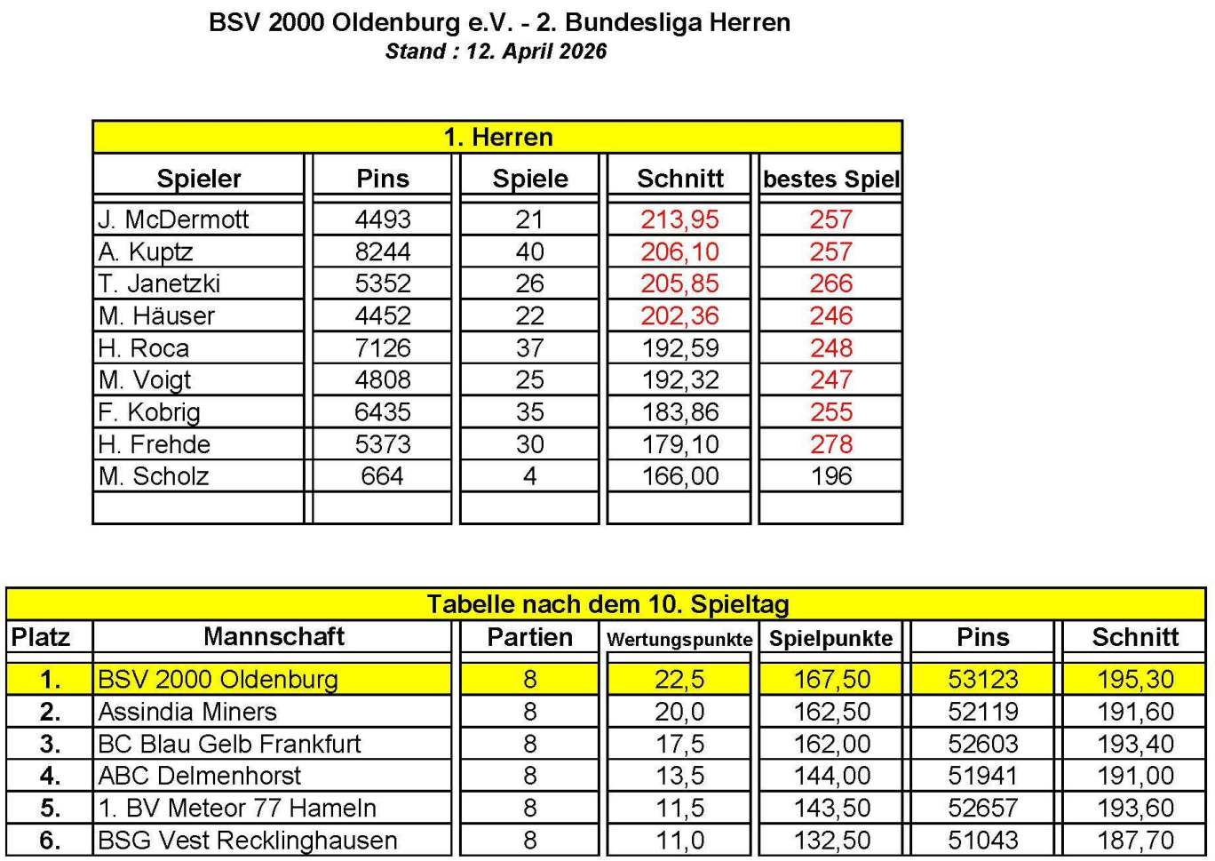 Am Sonntag spielten Tom Janetzki (884 / 221,0); Fabian Kobrig (1225 / 204,17); Marvin Voigt (1198 / 199,67); Markus Häuser (732 / 183,0); Anton Kuptz (360 / 180,0); Hector Roca (1024 / 170,67) und Henning Frehde (327 / 163,5).