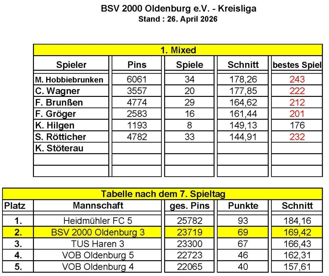 Gespielt haben Frank Brunßen (546 / 182,0); Marc Hobbiebrunken (909 / 181,80); Frank Gröger (807 / 161,4); Stefan Rötticher (769 / 153,8) und Karin Hilgen (259 / 129,5).