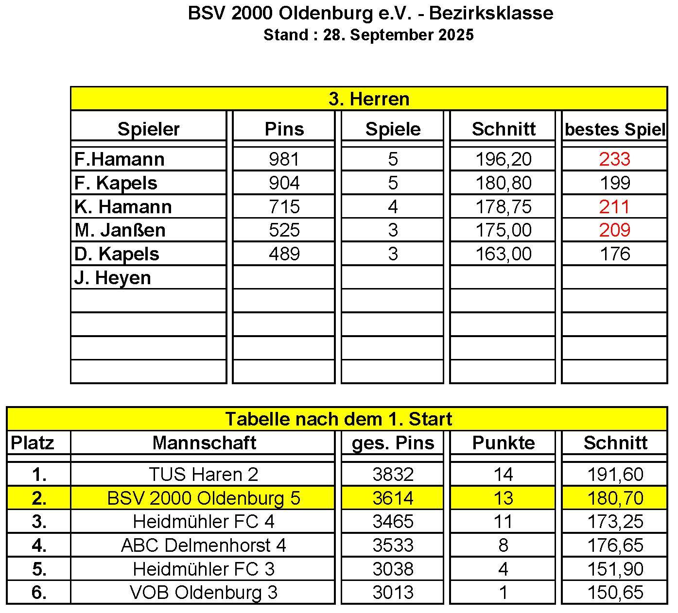 Die 3. Herren hatte am 28. September ihren 1. Start in der Bezirksklasse in Delmenhorst. Mit 4 von 5 möglichen Siegen, und 5 von 6 Bonuspunkten liegt das Team auf dem guten 2. Tabellenplatz. Ein guter Start in die Saison. Gespielt haben Fabian Hamann (981 / 186,2); Frederik Kapels (904 / 180,8); Klaus Hamann (715 / 178,8); Manfred Janßen (525 / 175,0) und Detlef Kapels (489 / 163,0).